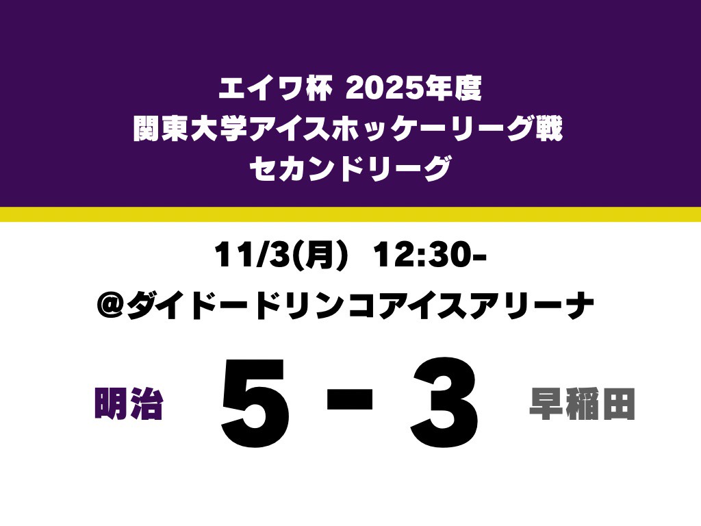2025年11月3日に行われました早稲田大学との試合は、5対3で明治大学の勝利となりました。