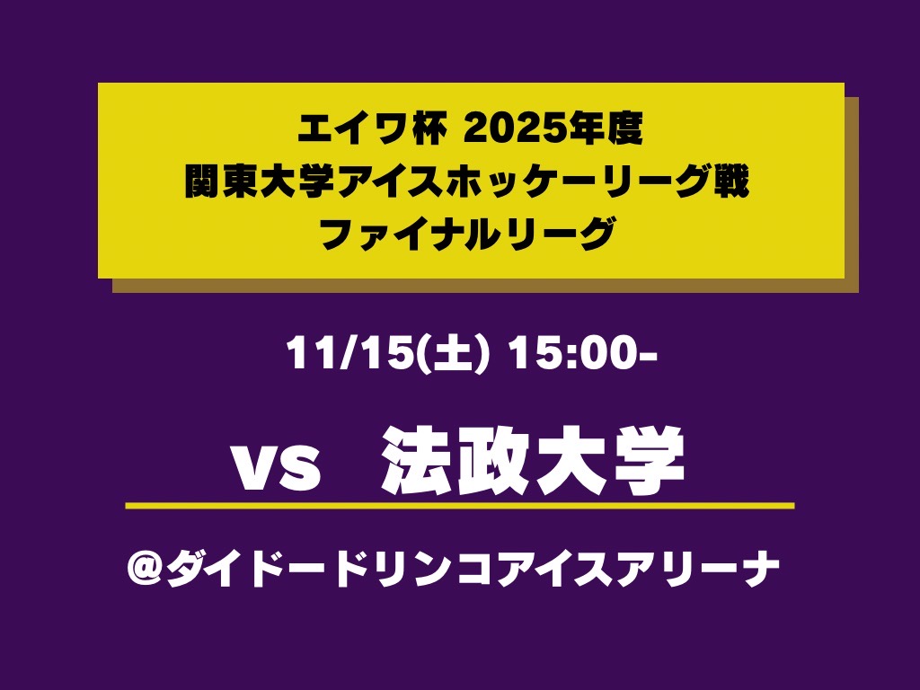 2025年11月15日にダイドードリンコアイスアリーナにて、法政大学との試合が行われます。